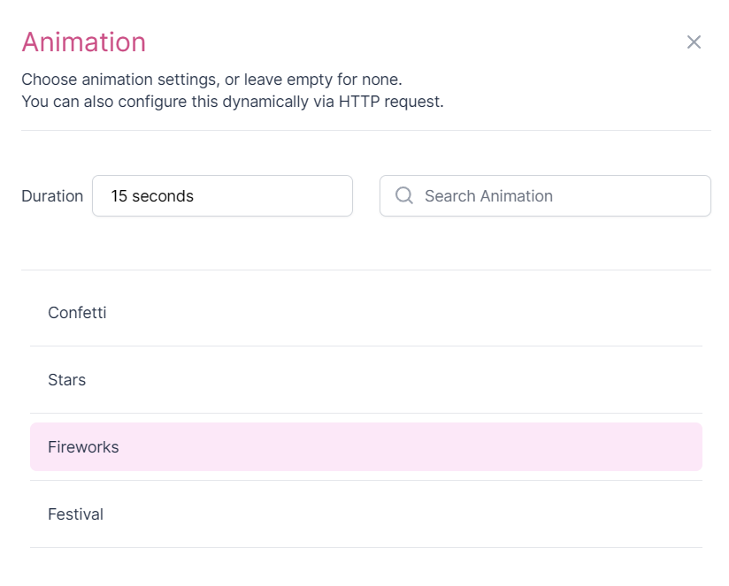 Animation Type – Choose from built-in effects like Confetti, Fireworks, or Stars.
