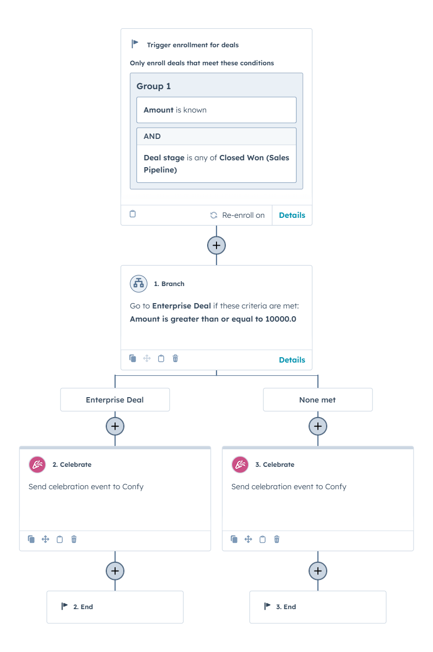 This workflow celebrates closed-won deals by triggering a Confy event. It branches based on deal size — deals over $10,000 trigger an "Enterprise" celebration, while all others trigger a standard one.