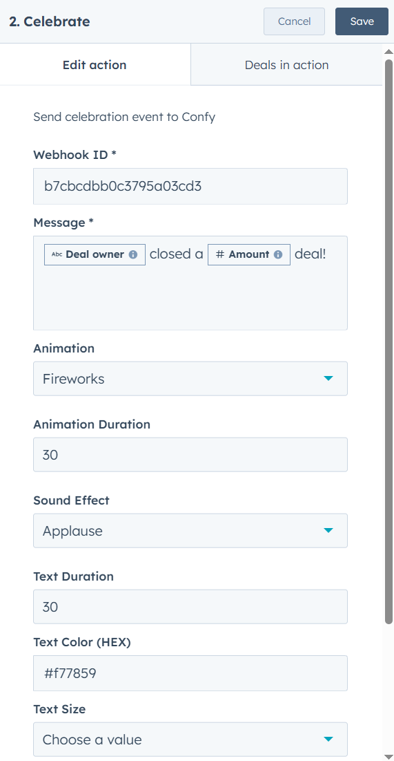 With Confy’s HubSpot app, you can trigger celebrations directly from HubSpot Workflows — no code, no hassle. It's a great way to recognize wins like new deals, closed tickets, or any custom activity in your pipeline.